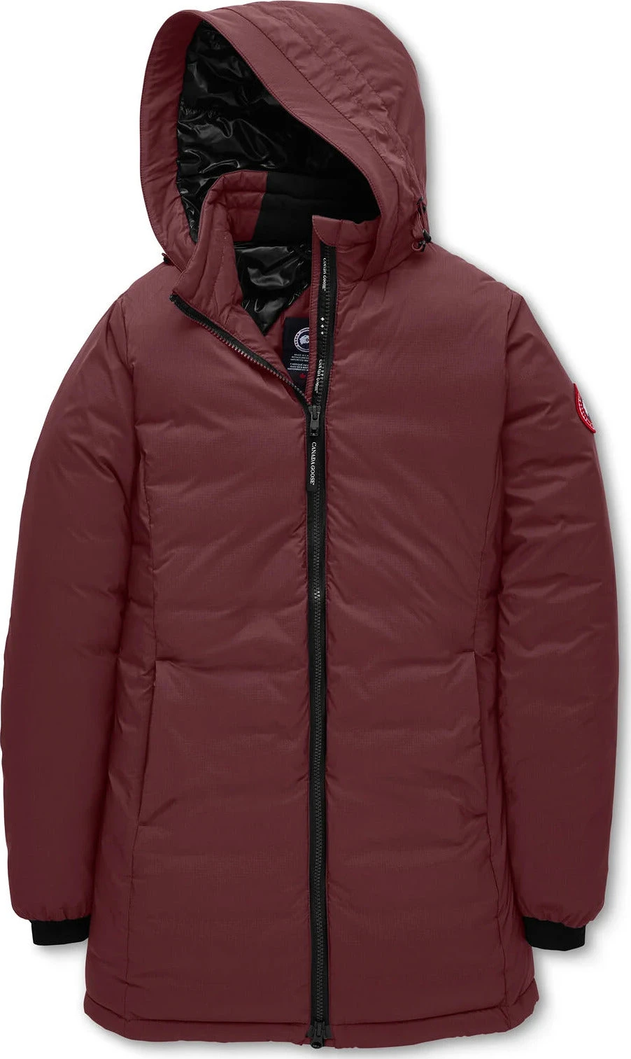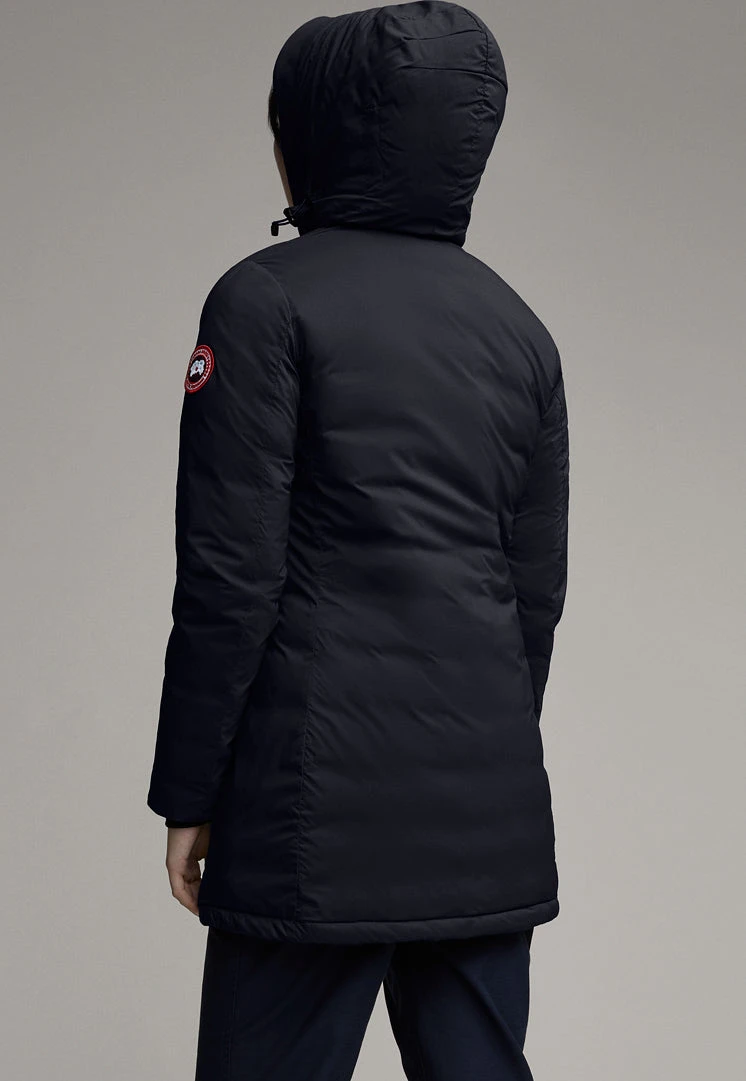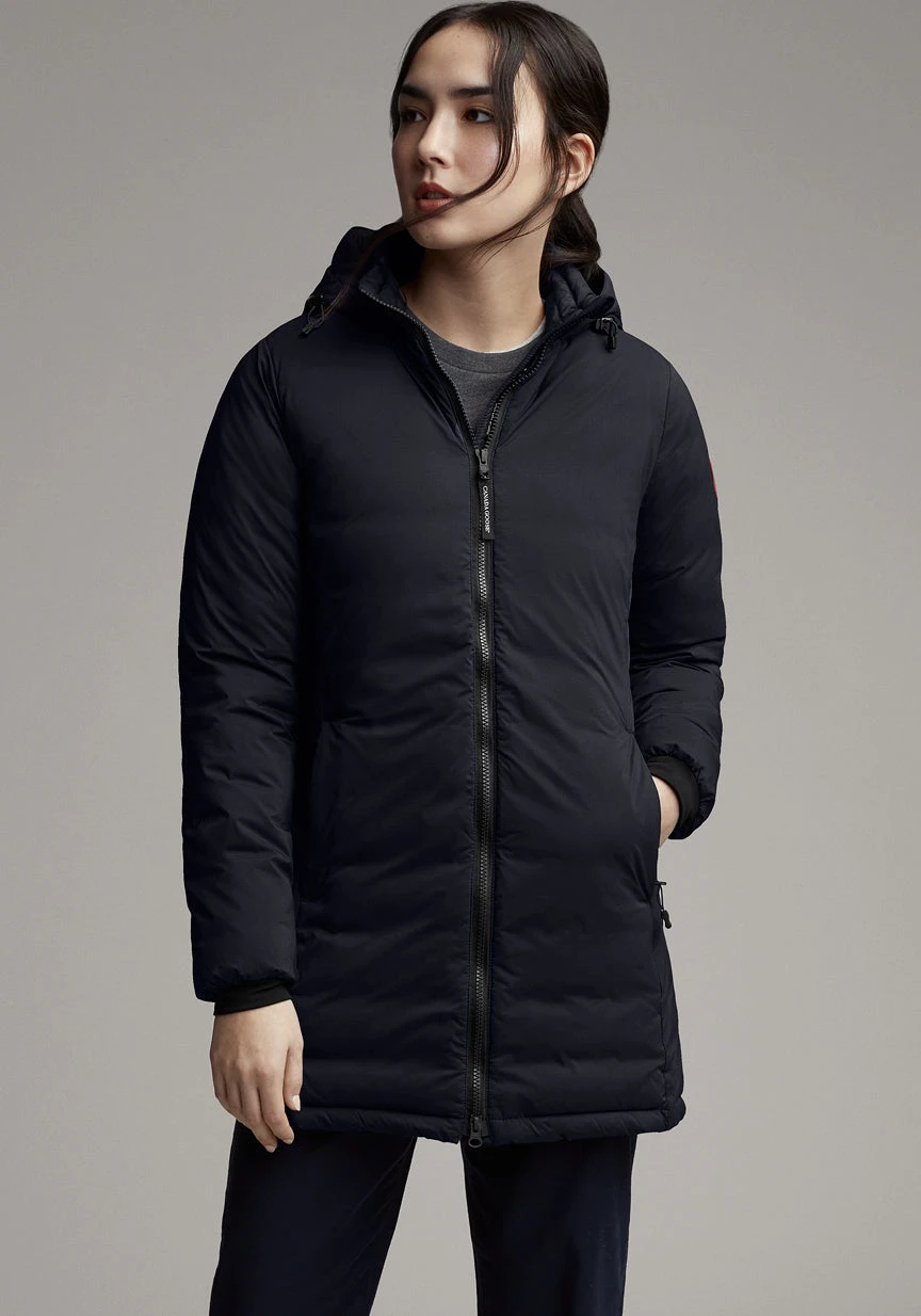 The Women’s CAMP Hooded Jacket by Canada Goose is a slim-fit down outer layer perfect for colder days. 750 fill power Hutterite white duck down keeps things warm and lofty on the inside. The insulated hood adjusts for more coverage from the cold, while tricot lining at the chin makes for a soft touch. The storm flap at the front zip shuts out wind. Two outer hand-warmer pockets and one inner pocket have zips. One drop-in pocket inside carries larger items.