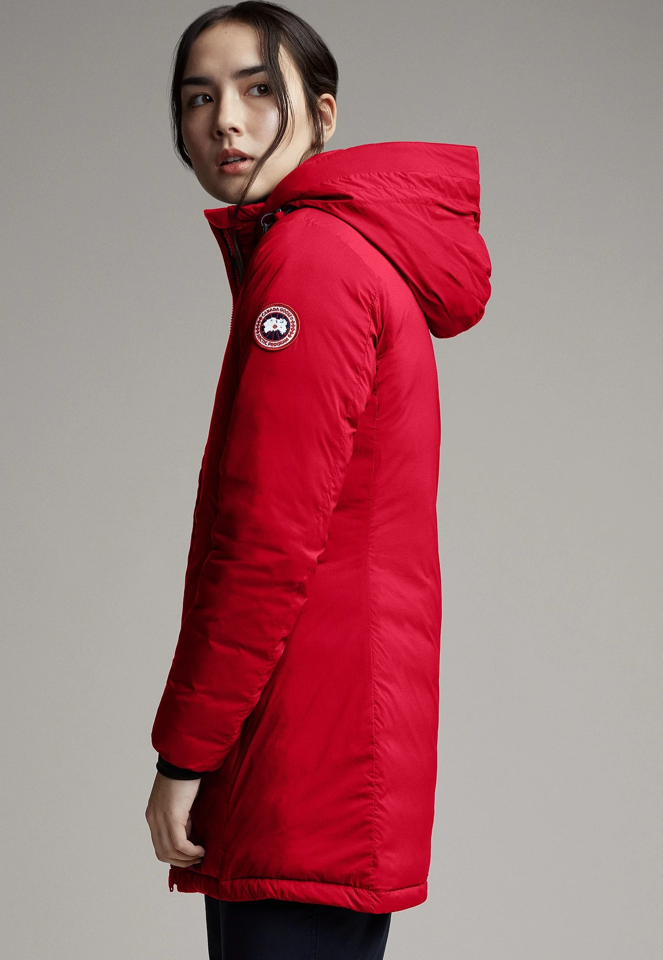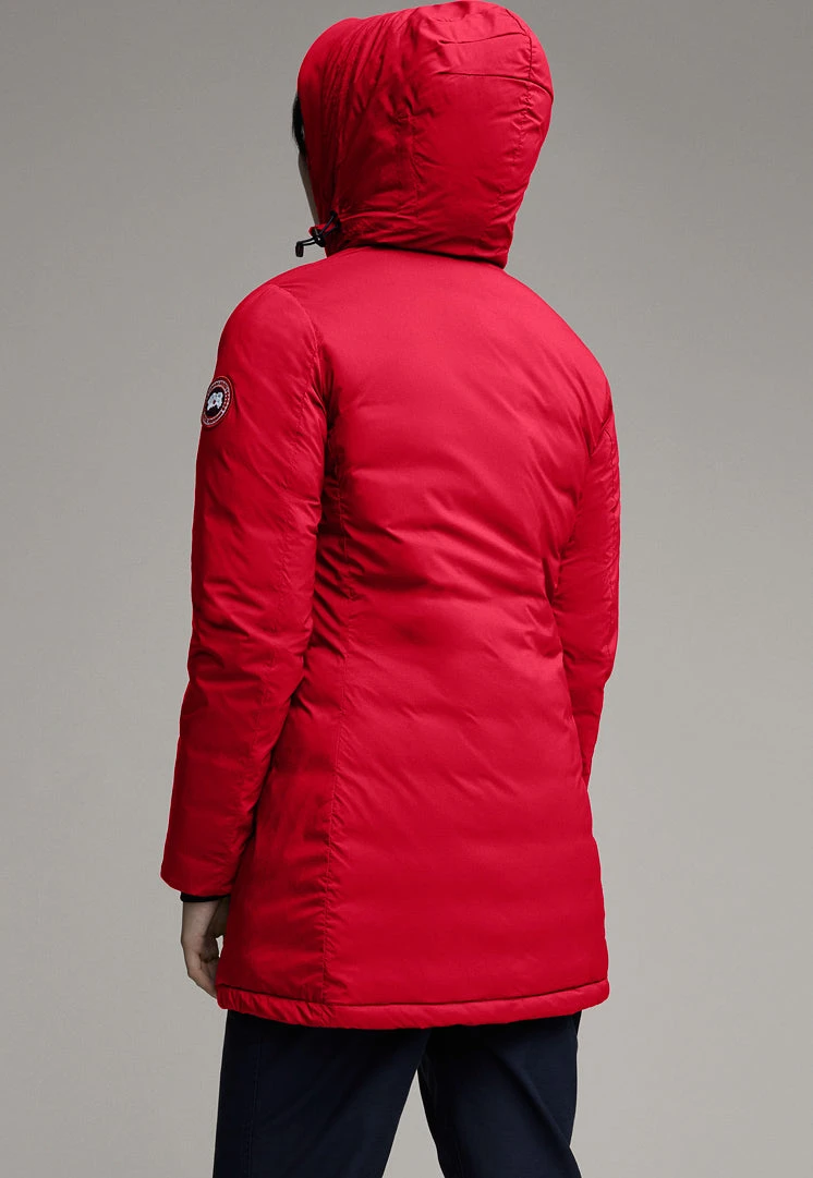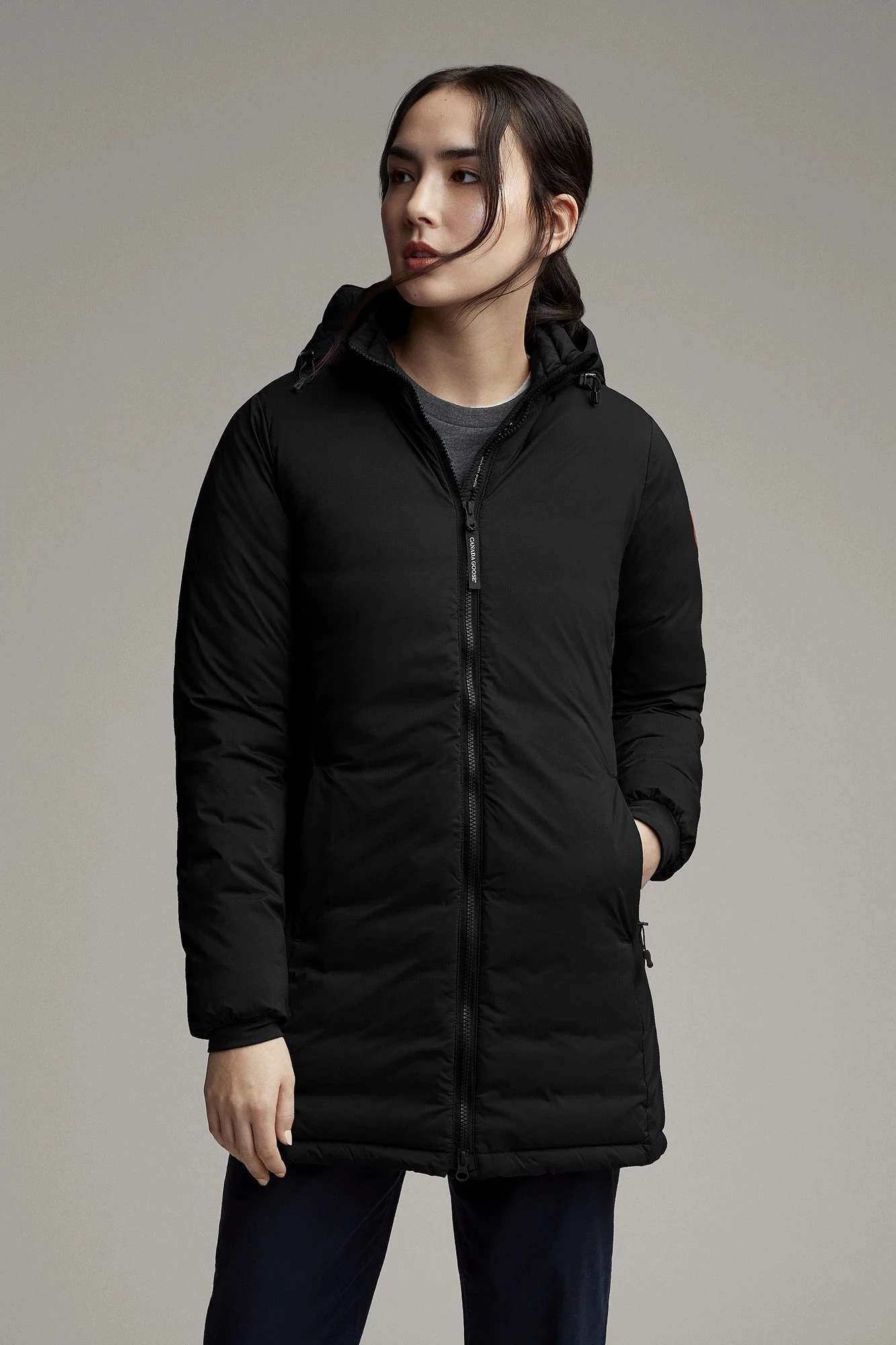 The Women’s CAMP Hooded Jacket by Canada Goose is a slim-fit down outer layer perfect for colder days. 750 fill power Hutterite white duck down keeps things warm and lofty on the inside. The insulated hood adjusts for more coverage from the cold, while tricot lining at the chin makes for a soft touch. The storm flap at the front zip shuts out wind. Two outer hand-warmer pockets and one inner pocket have zips. One drop-in pocket inside carries larger items.
