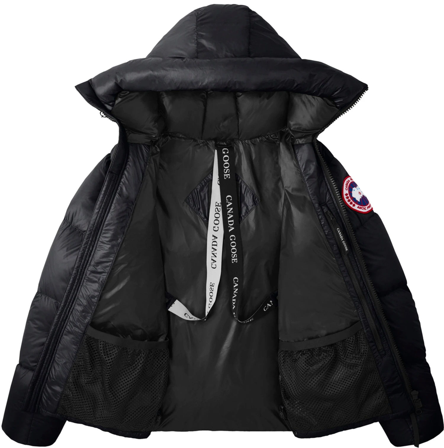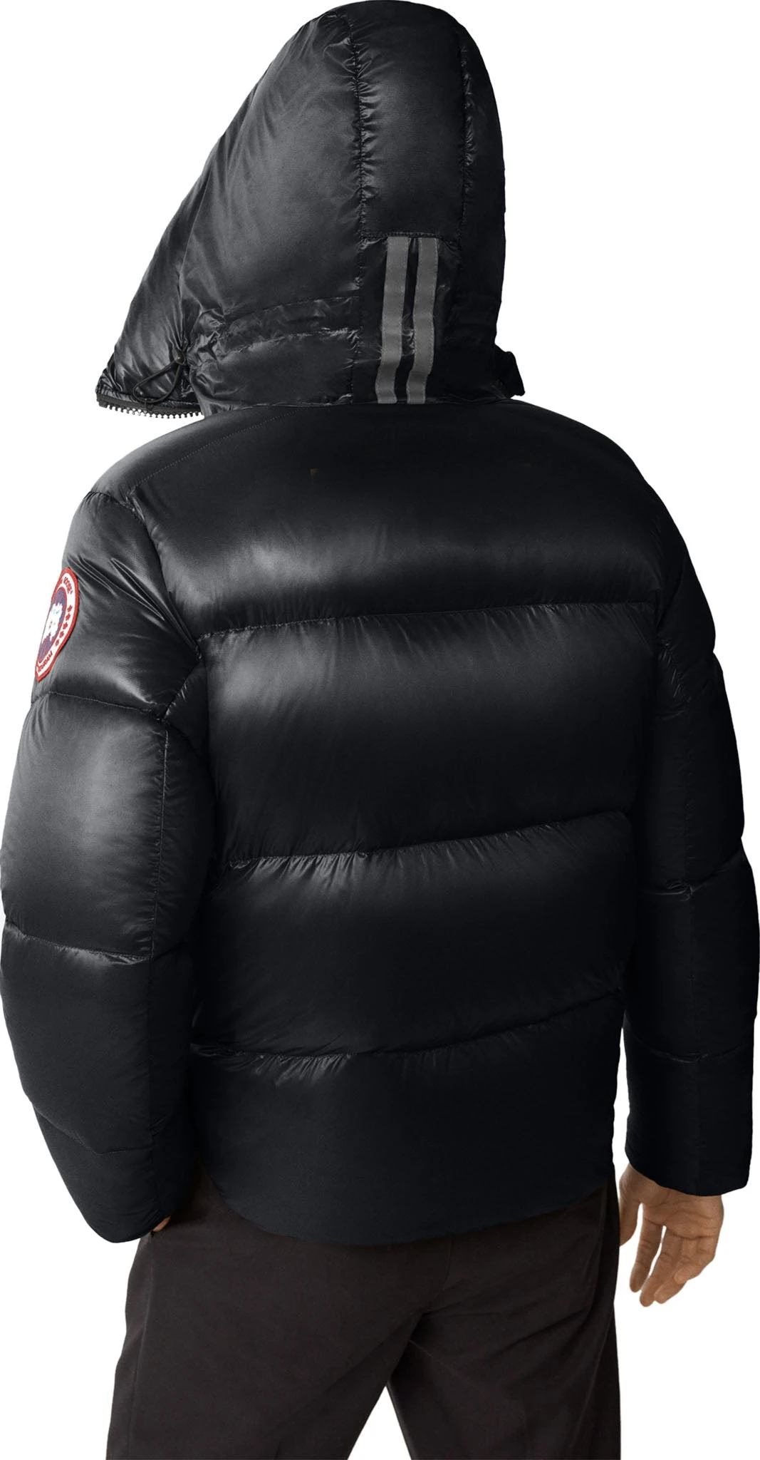 • Down-filled adjustable hood with cordlock adds warmth and element protection. Signature double-stripe black reflective details at the back add visibility in low light