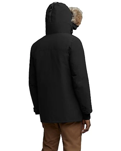 - Edgewood Black Label Parka in black with waist flap pockets, chest slip pockets and coyote fur trim hood