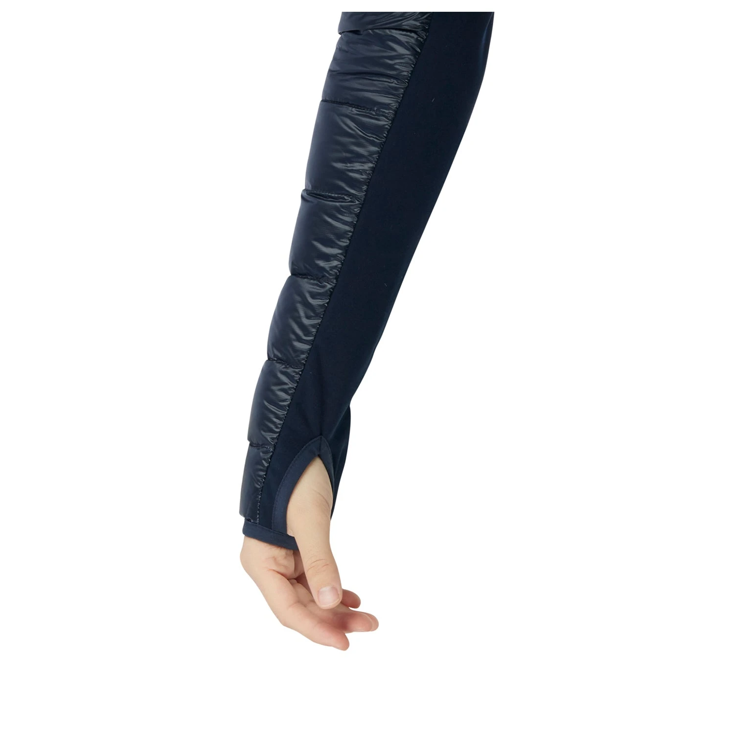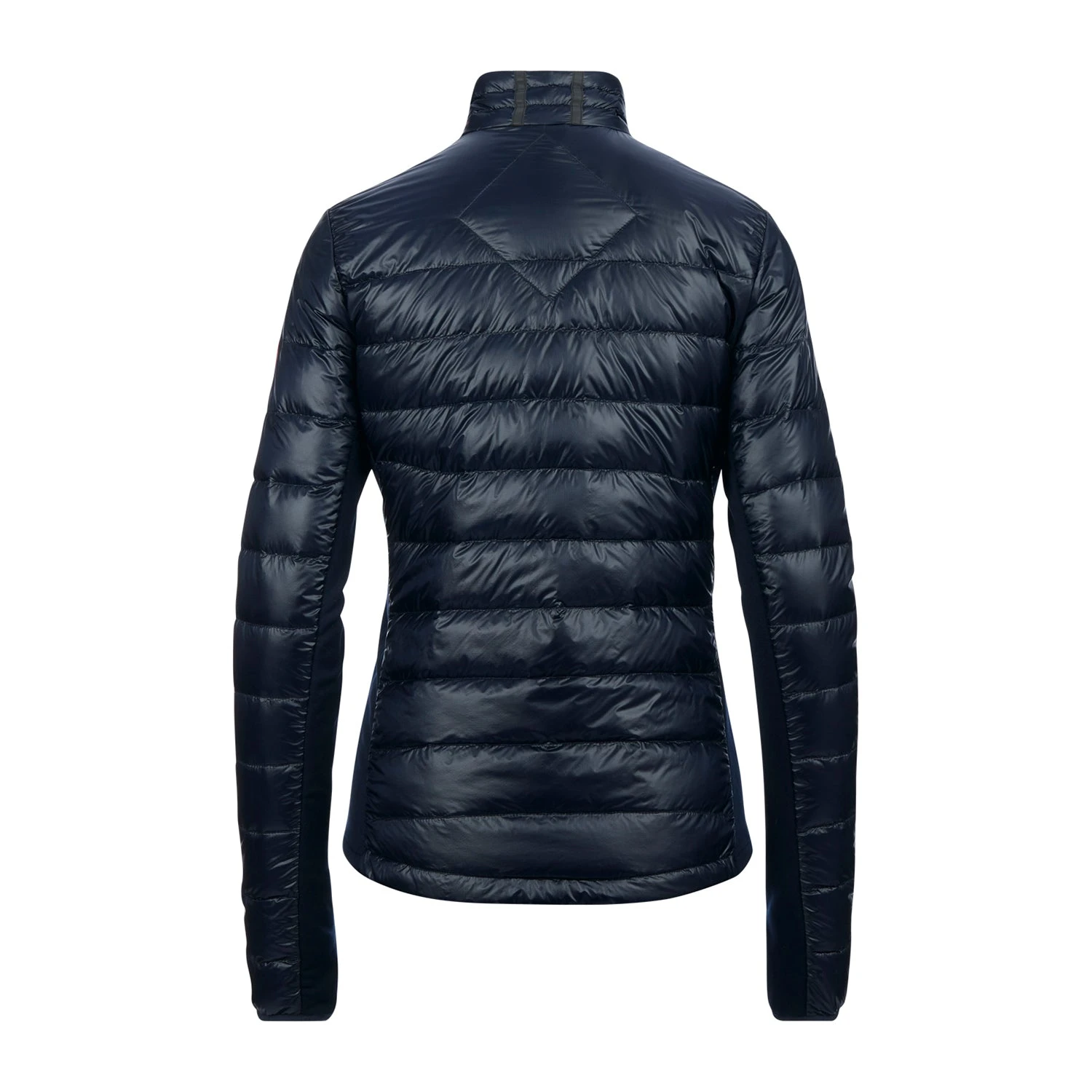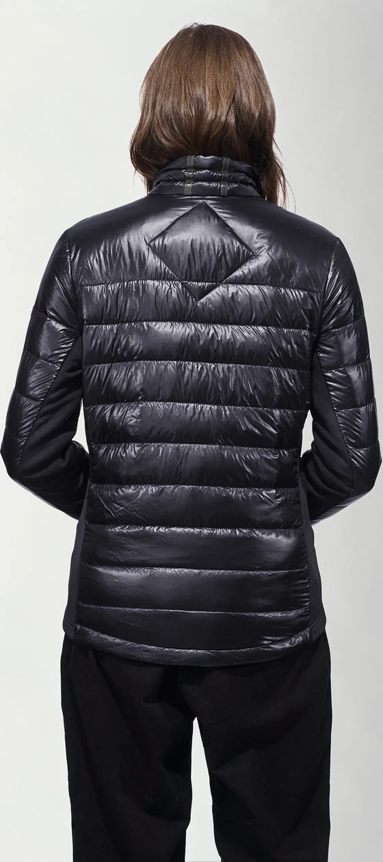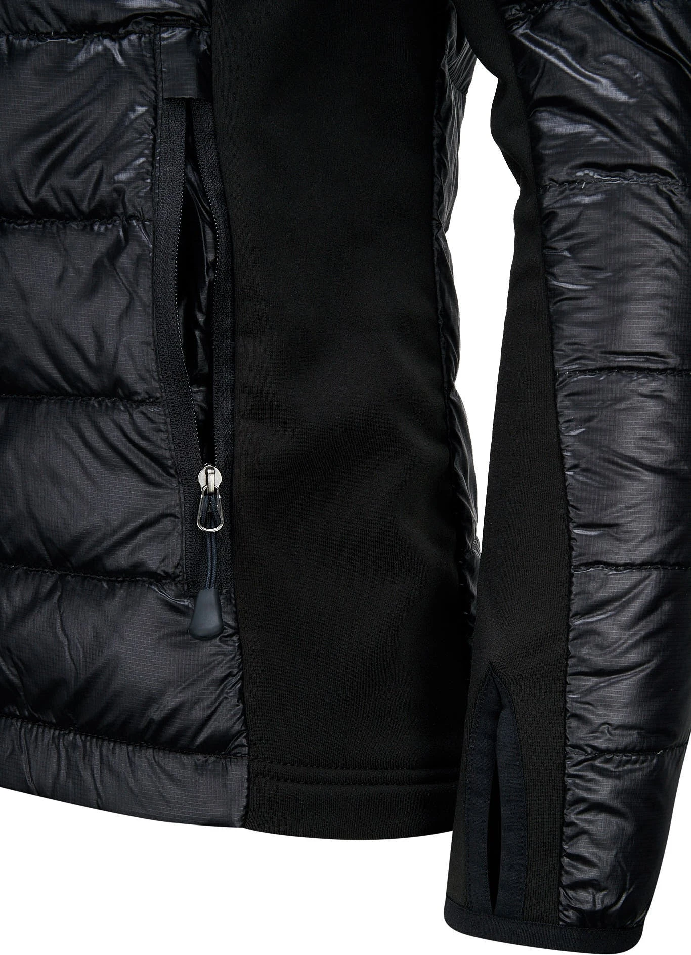 The women’s HyBridge Lite jacket was created for warmth and fitted performance in a design perfect for crisp adventures. It’s lined with plush Hutterite White Goose down insulation in quilt-through construction, reducing its overall pack size. Tensile-Tech hardface fleece placed along its underarms and side panels improve flexibility. Stretch cuff binding outlining the thumbhole loops help it layer under a shell during wet weather. A heavy-duty YKK reverse coil front zipper is two-way locking and backed by an insulated windguard. The collar is also insulated for warmth. The coat is designed to compress into its left pocket for storage that doubles as a travel pillow.
