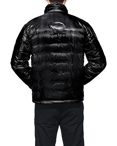 - Lodge Fusion Fit Down Jacket in black/black with collar and hem feature interior drawcords, down-filled collar with tricot fabric chin guard, packs into interior zipper pocket for easy storage, storm flap underneath 2-way zipper