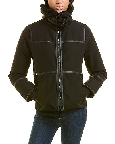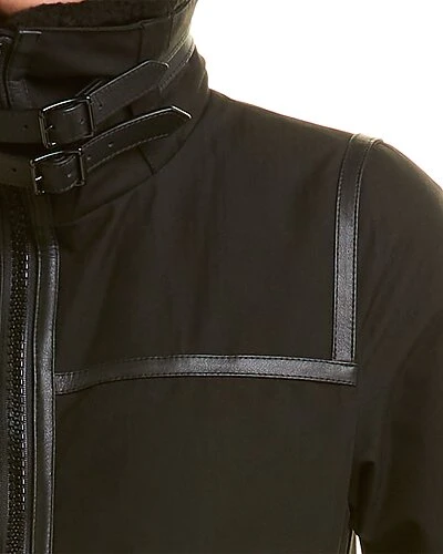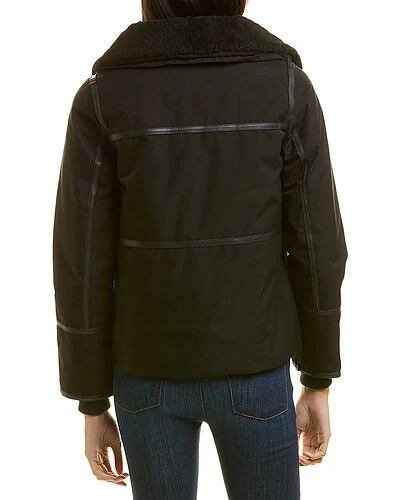 - Parklea Jacket in black herringbone with fur-lined stand collar with strap details, two front pockets, ribbed inner cuffs and quilted lining